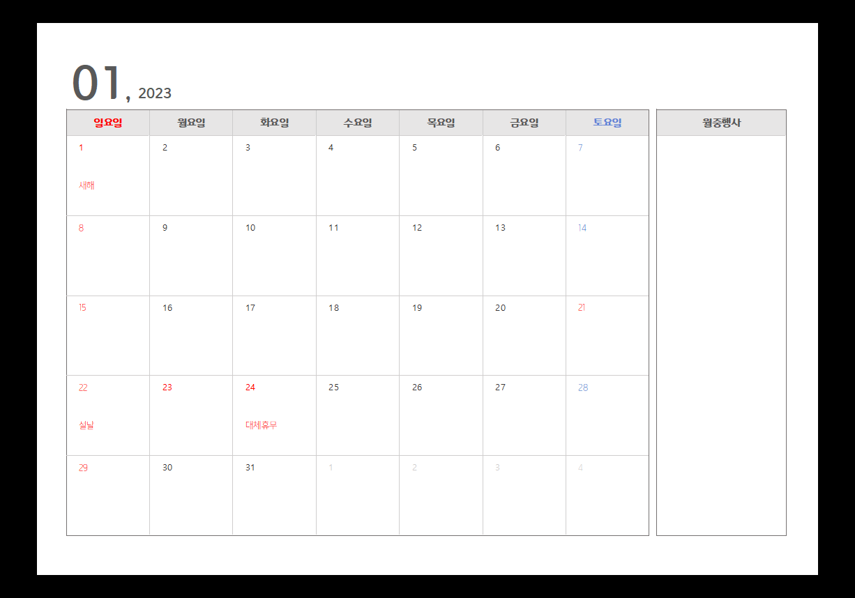 아래 포스트에서는 한글 2018 버전에서 만든 2023년 달력을 확인하고 다운로드 받을 수 있습니다. * 다운로드 받은 달력을 재배포하는 경우에는 반드시 출처 표시(링크 포함) 해야 합니다.